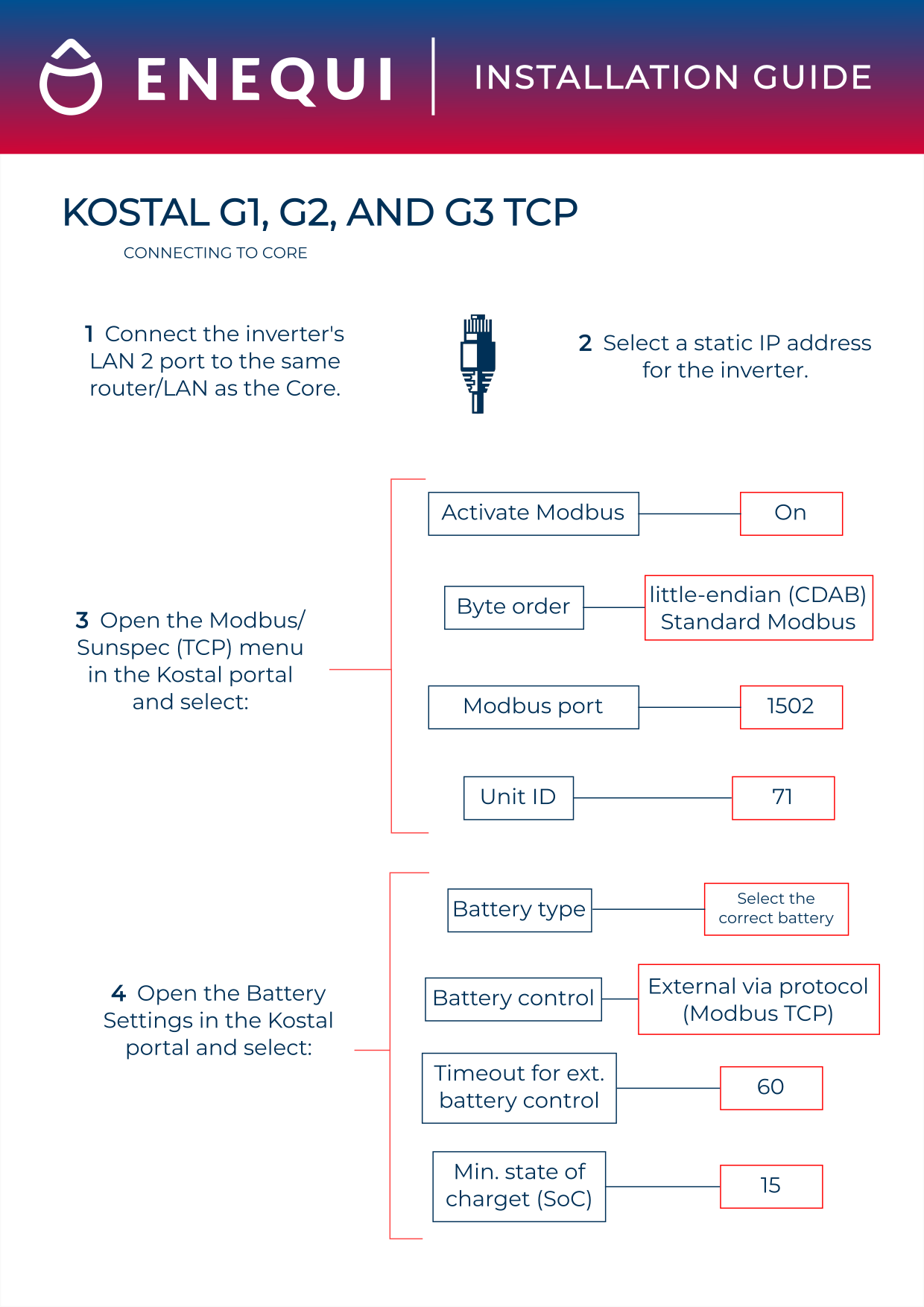 För att ta reda på mer om kompatibiliteten mellan ENEQUI och KOSTAL, klicka på följande länk ENEQUI- Manualer och dokument